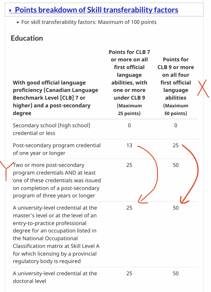 - 如果同时满足语言成绩(CLB 7/9)+ 学历的组合条件,还能额外获得 总计最多50分 的技能转移加分。